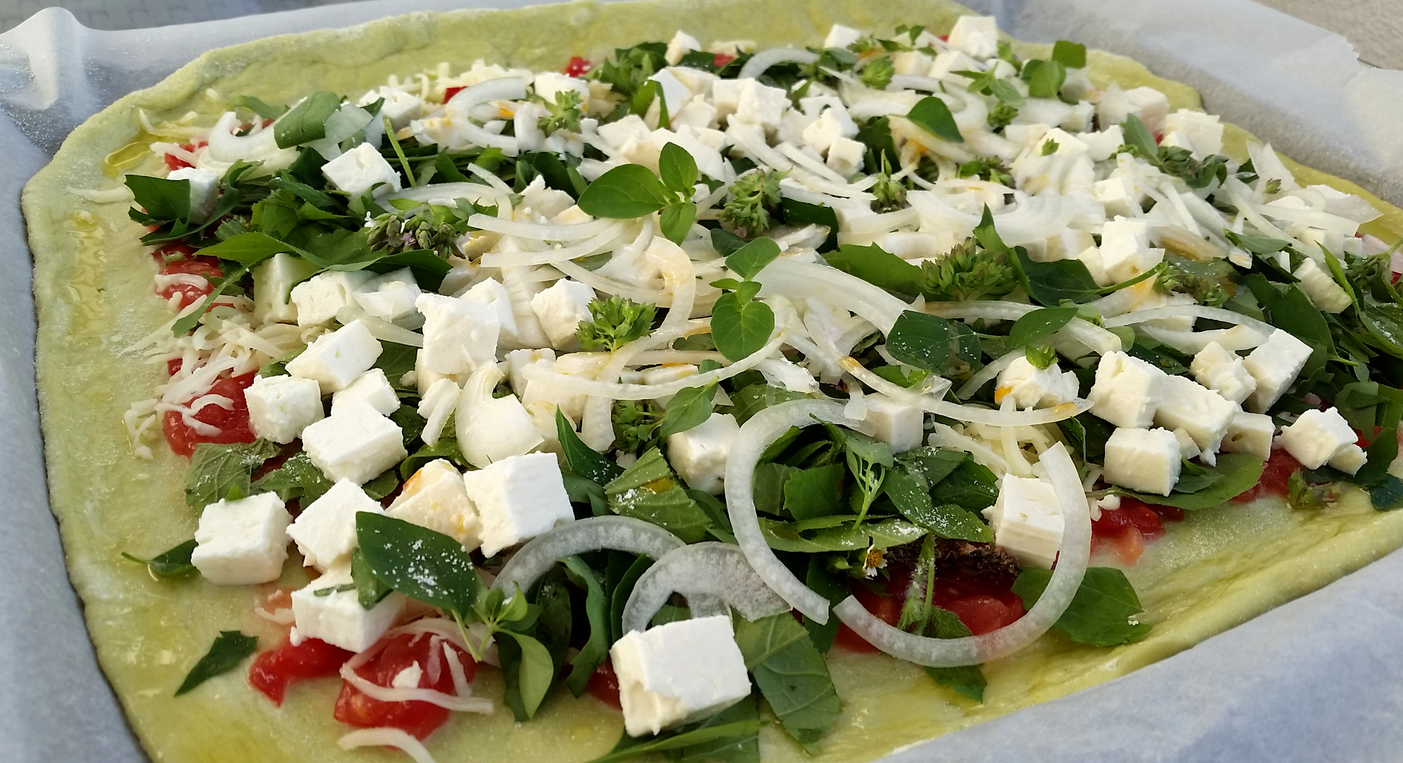 Wenn der grüne Pizzateig aufgegangen ist, ausrollen und als erstes mit der frischen Tomaten-Sauce bestreichen und dem Pizzakäse bestreuen, Franzosenkraut und Ackermelde drauf verteilen, danach den Feta und die Zwiebel draufgeben. Zum Schluss die Pizza noch mit Salz und Oregano/bzw. Majoran würzen. Den Rand mit Olivenöl einstreichen und ab ins Backrohr für ca. 15 min. bei 180 °C Heißluft.