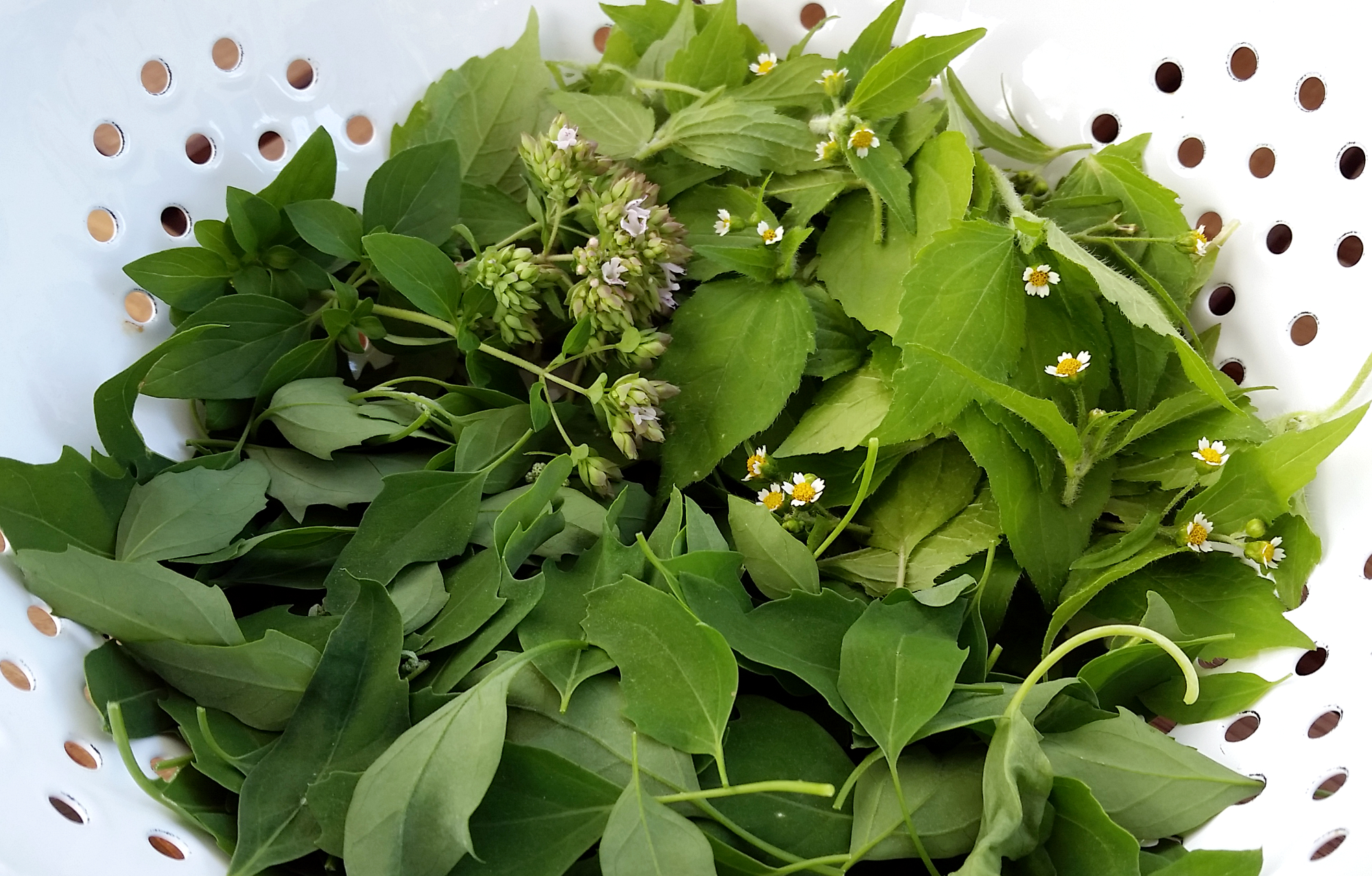 Zukünftiger Pizzabelag: rechts oben das Franzosenkraut, links oben blühender Oregano und unten die Melde